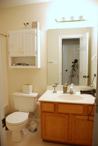 I love the vanity and mirror. To me, somehow the area over the toilet looks busy in comparison to the simplicity of the vanity area. Lots of little things in colors that are not tied in anywhere else in the bathroom.