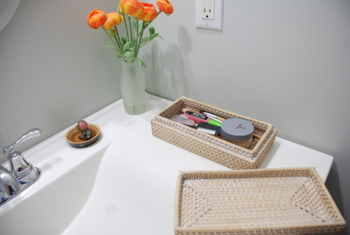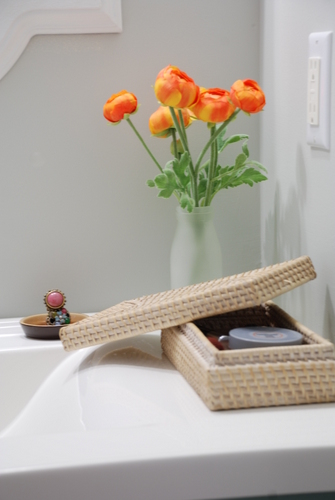 This is my favorite corner. Before, we had a side splash, and they shape of the sink barely allowed space for my hair brushes. Now, a ring holder (yes, I put my funkiest rings in it), eternally blossoming ranunculus flowers and a woven basket.