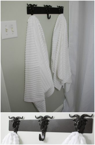 Another favorite accessory (okay, you caught me, they’re all favorite accessories) is this rams head coat hanger. I’m using it as a towel hanger. It was originally painted Carolina blue, but I covered it in oil-rubbed bronze.