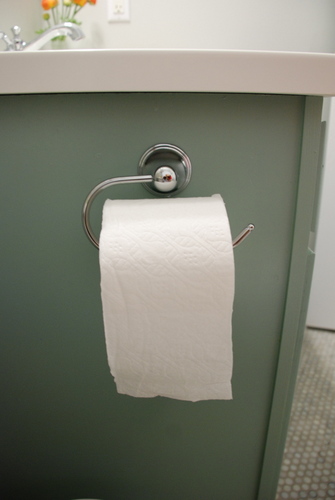 The vanity was complete with a toilet paper holder. Again, something purchased on sale. Yes, I cringed while drilling holes in my pretty, pretty vanity.